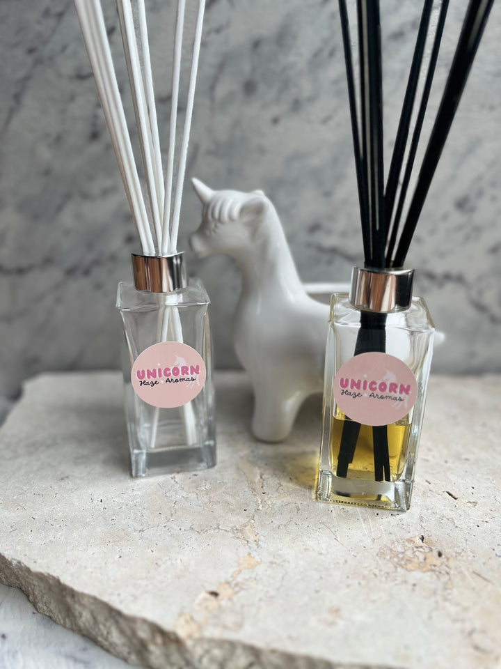 Our Unicorn Haze home diffuser is designed to suit any home decor or room in your home or even an office space. Home diffusers are an alternative for anyone that does not like to burn a candle with a naked flame. Our Manhattan diffuser is a stylish crystal clear bottle embelished with a silver collar. You are able to then accent them with either black white or Natural wood reeds. Manhattan diffusers are available in all frangrances.